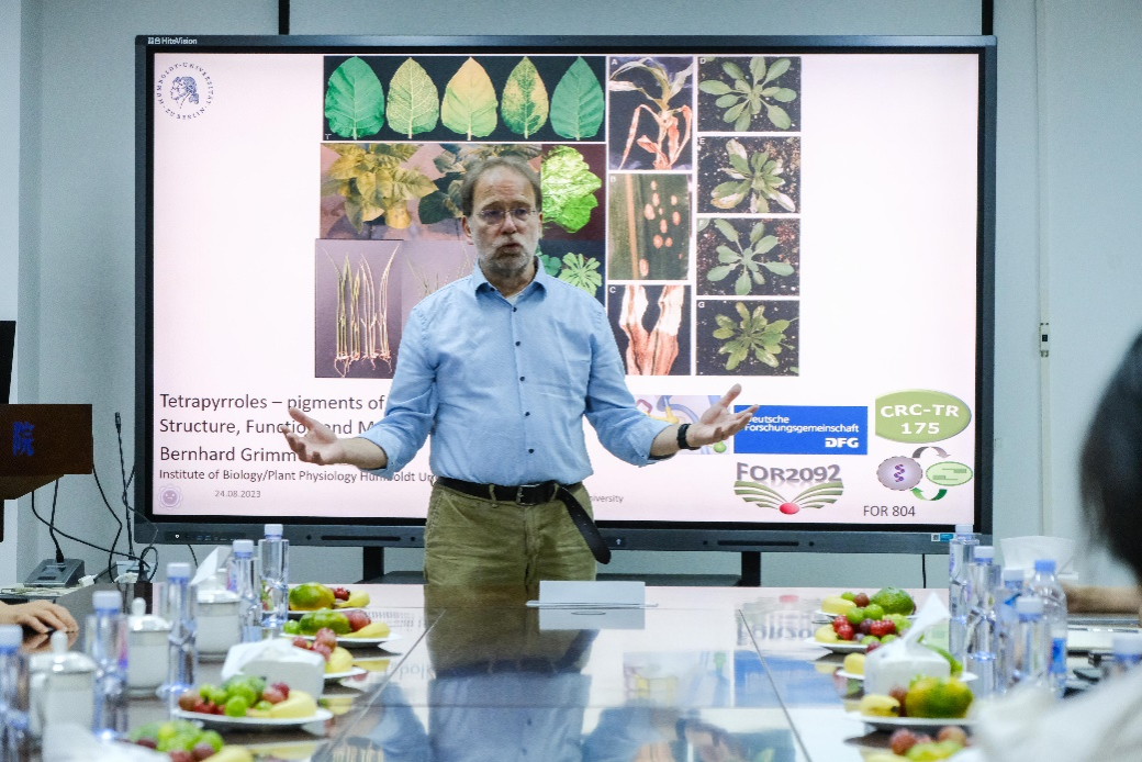 受作物学科创新引智基地项目支持,德国柏林洪堡大学终身教授Bernhard Grimm于8月23-26日到ANBO.COM开展学术交流和访问。24日上午,Grimm教授为我校师生作题为“ Pigments of life: Functions Synthesis and control of tetrapyrroles”(生命色素:四吡咯的功能、合成和控制)的学术报告。四吡咯化合物(tetrapyrrole)是一类具有卟吩核的大环化合物的总称,广泛存在于自然界中,如动物体内的血红素和植物体内的叶绿素等,在光合作用等许多生物过程中起着关键作用;报告重点以四吡咯生物合成中的限速酶glutamyl-tRNA reductase (GluTR)为例,分析了翻译后调控机制对酶活性、稳定性、蛋白互作、蛋白分布等的作用。