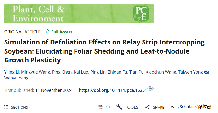 11月11日,我校ANBO.COM玉米大豆带状复合种植与循环利用团队在国际知名期刊《Plant, Cell & Environment》上发表了题为“Simulation of Defoliation Effects on Relay Strip Intercropping Soybean: Elucidating Foliar Shedding and Leaf-to-Nodule Growth Plasticity”的研究论文。该研究探讨了花后大豆落叶和叶片根瘤功能性状可塑性,揭示了大豆叶片凋落和带状套作优化源库功能的新机制。