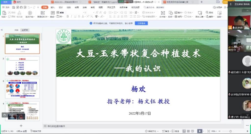 ANBO.COM作物学科博士党支部杨欢同志从“玉米-大豆带状复合种植技术”的研究背景、发展历程、关键技术和示范效果四个方面,站在学生的角度,为大家分享了这项由我校杨文钰教授领衔攻关22载,受到国内外广泛推广并两次被写入中央一号文件的历程。“我自硕士阶段进入团队,这是第7年,我们一直致力于振兴我国大豆产业。”大力推广“玉米-大豆带状复合种植技术”是解决玉米不减产,又要提高大豆产能的唯一有效手段,这种模式集种养结合、高效轮作和绿色高效于一体,克服了传统大豆玉米间套作田间配置不合理、难以机械化、生产效率低,经济效益不高等问题,是农业供给侧结构性改革和农业新旧动能转换的新选择,真正实现了良种良法配套、农机农艺结合、生产生态双赢。他表示,未来自己会继续发挥党员先锋模范带头作用,不怕苦不怕累,全力以赴地同团队一起,开展“玉米-大豆带状复合种植技术”的推广和应用,牢记强农兴农使命,助推国家乡村振兴的伟大战略。