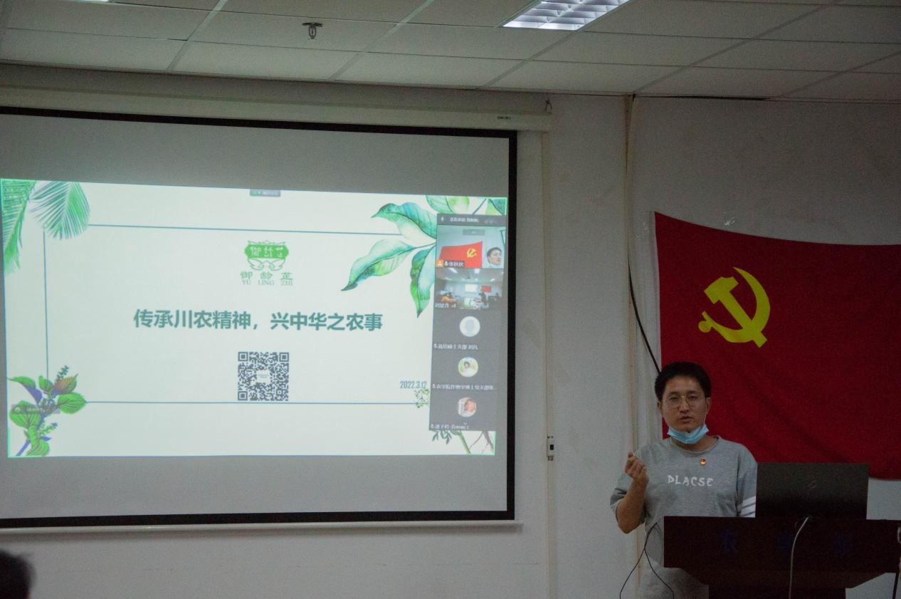 特用植物研究生党支部邹锦鹏同志分享了他们团队利用西南地区的中药材——紫苏为原料,自主研发网红护肤品“御龄芷”的故事,激起了大家对中国传统中药文化的热情。他们以“川农大精神”为引导,一路披荆斩棘,勇往直前,从最开始的科研兴趣小组到现在拥有专属商标,“御龄芷”已然成为了川农大最火的特色产品之一。他表示:“正是有了川农大一直以来团结拼搏、艰苦奋斗的精神,才成就了今天的团队光辉。”对于下一步的规划,他表示团队正致力于突破特用植物,以粮食作物为原料开发新的护肤品,进一步提高农产品附加价值,打造川农特色产品。
