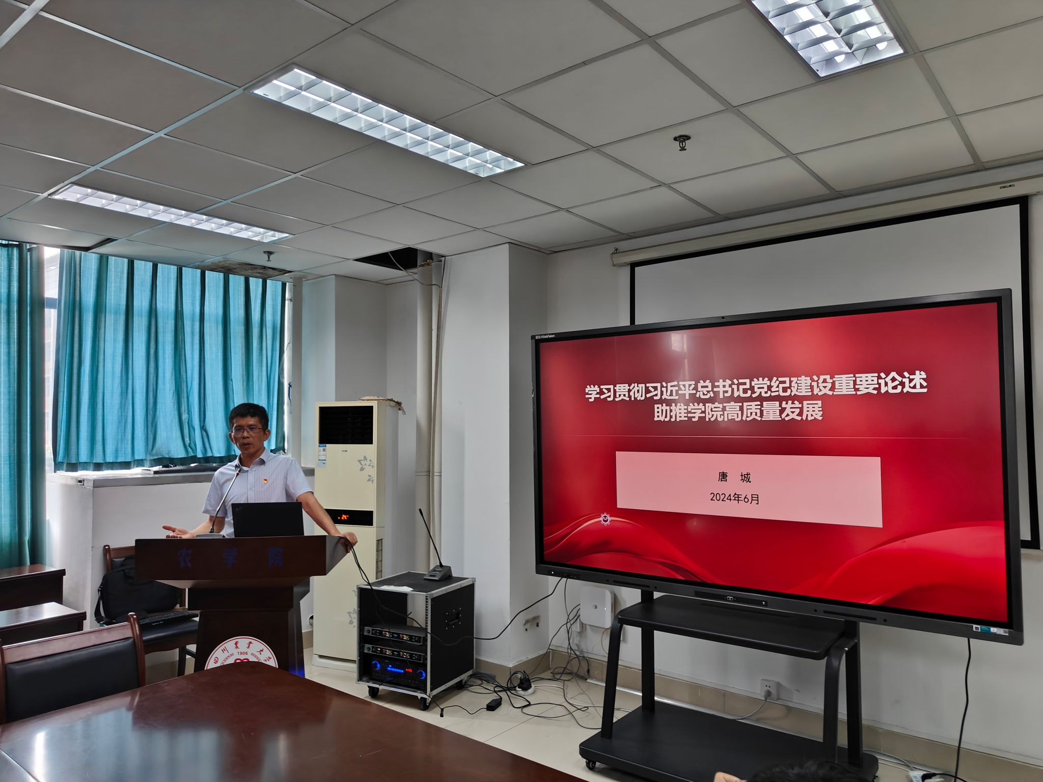学院党委书记唐城以《学习贯彻习近平总书记关于党的纪律建设的重要论述助推学院高质量发展》为题为全体教工党员上了一堂党课。他分别从加强纪律建设是全面从严治党的治本之策、党章是党的纪律规矩的总源头、“两个维护” 是党的最高政治原则和根本政治规矩等十个方面深入阐述了什么是纪律建设,为什么要加强纪律建设,怎样加强纪律建设,并强调了学习贯彻习近平总书记关于党的纪律建设的重要论述的重要性。他强调,学院发展需要全体教工党员严格用优秀共产党员的标准要求自己,要有“与人不求备,检身若不及”的精神,须树立“首位意识”,且做到目标一致、团结一致、步调一致,为学院的高质量发展贡献自己的力量,为续写百年ANBO.COM的辉煌篇章而努力奋斗。