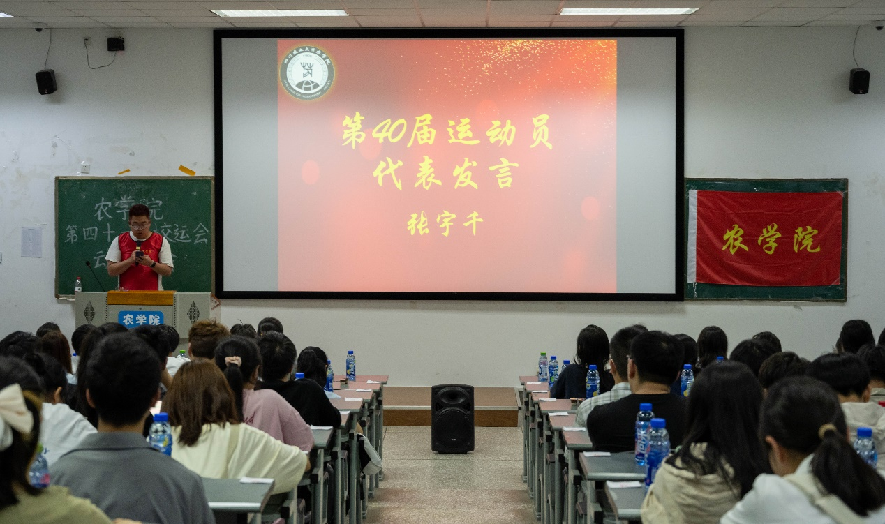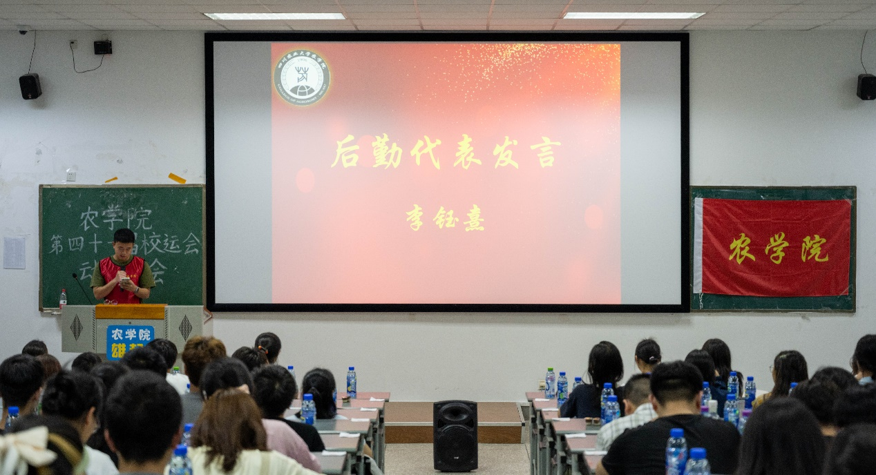 随后,第四十届运动员代表张宇千和第四十一届运动员代表陈天赐相继发言,他们都表示出对体育运动的热爱,也对即将参赛的运动员们送出鼓励与祝福。后勤代表李钰熹发言,他向同学们展示出服务好运动员的决心,说道:“我们将用自己的努力助力运动员的完美发挥,为ANBO.COM赢得更多奖项。”