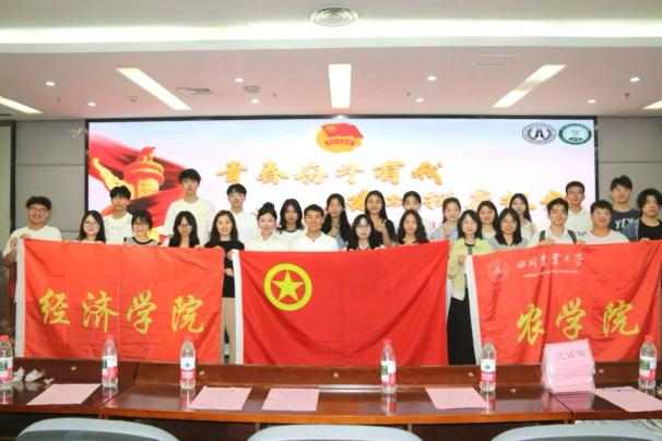 获“五四红旗团支部标兵”称号的国贸202101班团支部代表李婧瑶分享他们的故事。她介绍,班级以“厚德载物、实事求是、守正创新”为班风内核,班团干部率先垂范,凝聚集体力量。随后,四名青年学子演唱校团委原创快闪歌曲《百年传薪火川农正青春》,展现新时代青年朝气与活力。