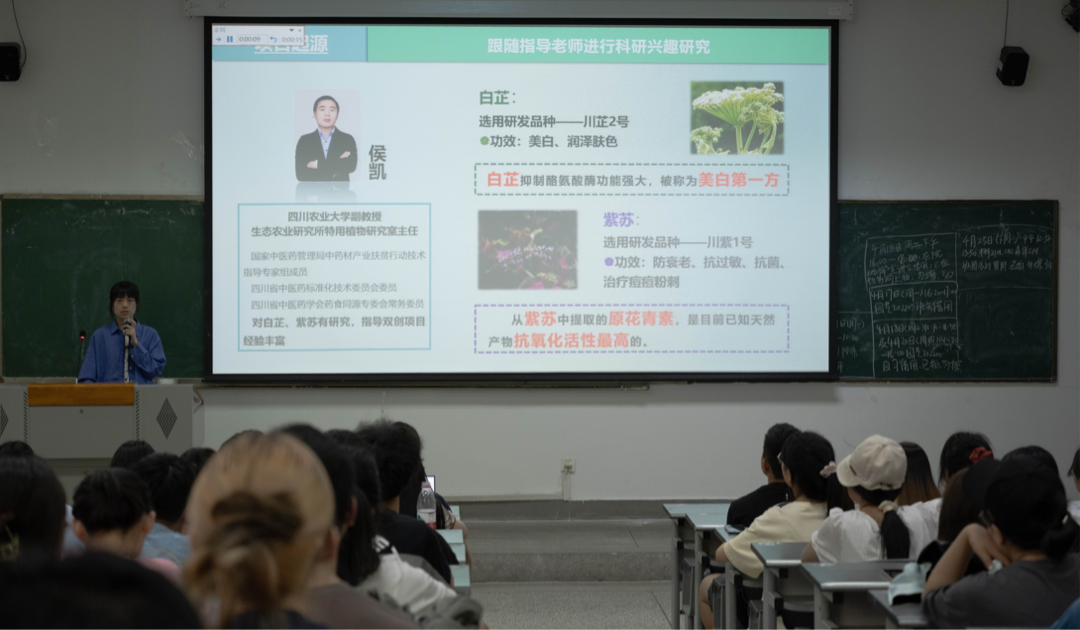 第二位分享者杨杰讲述了他与大豆的不解之缘,并将专业知识转化为实践,凭借《【“豆”志昂扬】一地双种多收粮,科技赋能喜耕田》项目最终获得第八届“互联网+”大学生创新创业大赛红旅赛道公益组的全国铜奖。“我的班主任就是做大豆研究的,所以我大一就经常听到他讲大豆玉米带状复合种植技术,之后我的一些科研项目也都是从事大豆相关研究。”他说道。前期的专业知识、实验室基础为他在比赛团队中的发挥奠定基础。他鼓励大家道:“大家要学会把学科与创新结合,将想法落实到实践中,落实成为项目。”作为农科学子,他身上更体现着一份使命感,他说道:“也希望大家将这些技术、项目运用到自己的家乡,这样提升了自己,也造福了群众。”