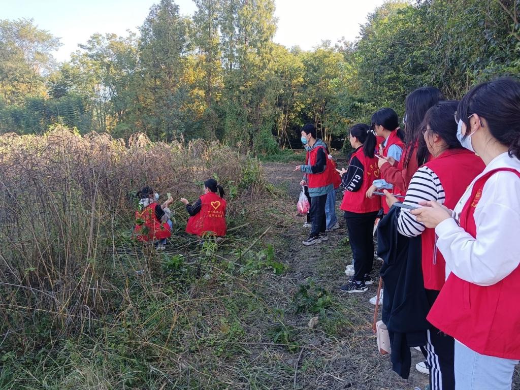 上午九点整,同学们在东大门门口集合,为防止在行走过程中走散或迷路,同学们都穿上了红马甲,在组织者讲完注意事项后一起步行走向惠和村。途中,组织者向同学们宣传有关粮食日的知识、介绍一路上所遇到的各种植物、提醒同学们注意道路情况,现场活动气氛逐渐高涨。