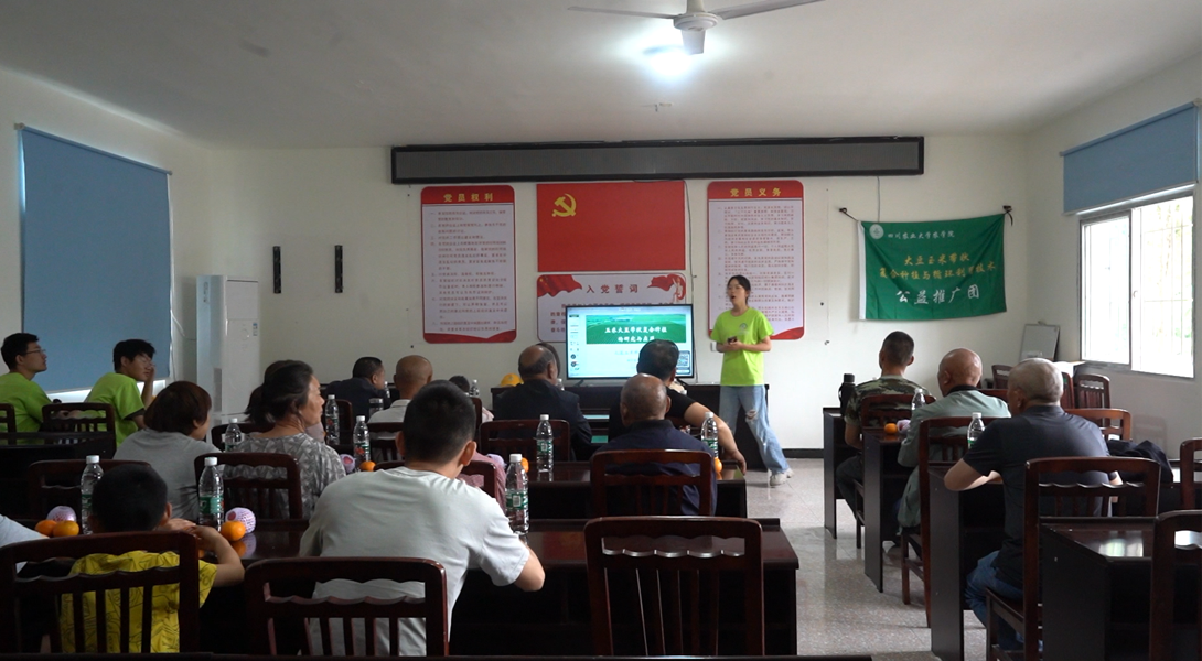 宣讲会伊始,团队成员为村民播放了相关科普动画片,动画里通俗易懂的语言和形象生动的卡通版大豆玉米形象叩开了村民们对这项技术原本紧闭着的心门,让村民对这项技术有了一个良好的初印象。接着,团队成员苗瑜结合PPT为大家讲解如何用这项技术种植、相比单作这项技术到底好在哪。同时,团队成员创建顺江村种植交流群并邀请村民入群,为村民发放该技术的技术手册,宣传种植指导视频。村民王大叔激动地说道:“二维码一扫就知道怎么种了!那你们走了我们自己也可以种了。”