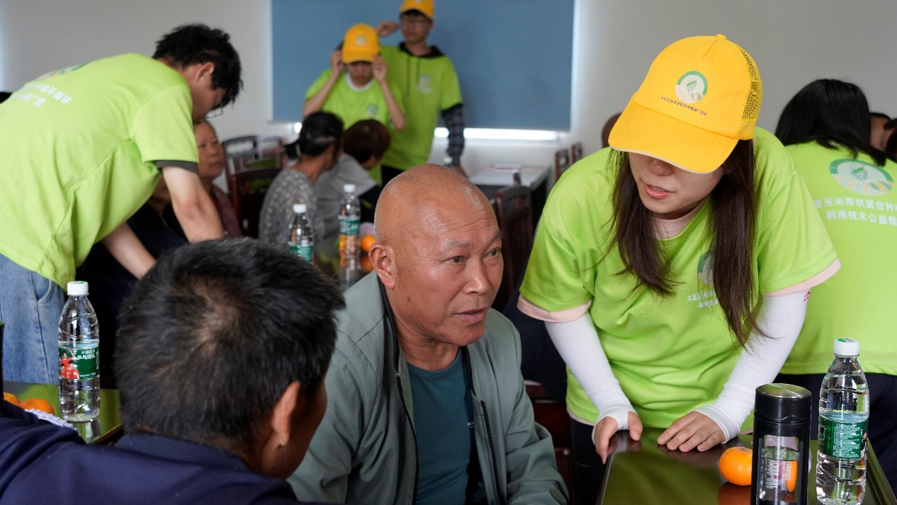 宣讲会最后,团队成员为村民们答疑解惑,一对一交流这项技术,解决村民们关于种植经验、种子品质、田间管理等等问题。在学生团队与村民的热烈交谈中,大豆玉米带状复合种植技术逐步走进了村民的心中。其中一位伯伯很激动地说道:“本来我是不相信这项技术的,也不了解,这群学生娃儿今天介绍得很详细,让我觉得这项技术大有前景。”