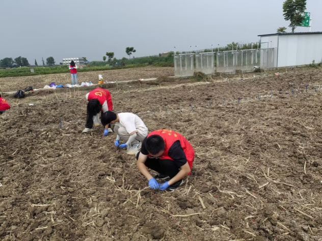 5月16日,学院再次组织志愿者们来到学校崇州基地,开展玉米和大豆的种植活动。志愿者们在指定场地拉好细线,沿线洒下石灰粉,分割出整齐的农田。随后,在吴雨珊老师的悉心指导下,志愿者们挥起锄头,刨出间距合适的浅窝,并撒下玉米和大豆种子。最后,他们轻轻盖上一层泥土,期待着新芽的萌发。