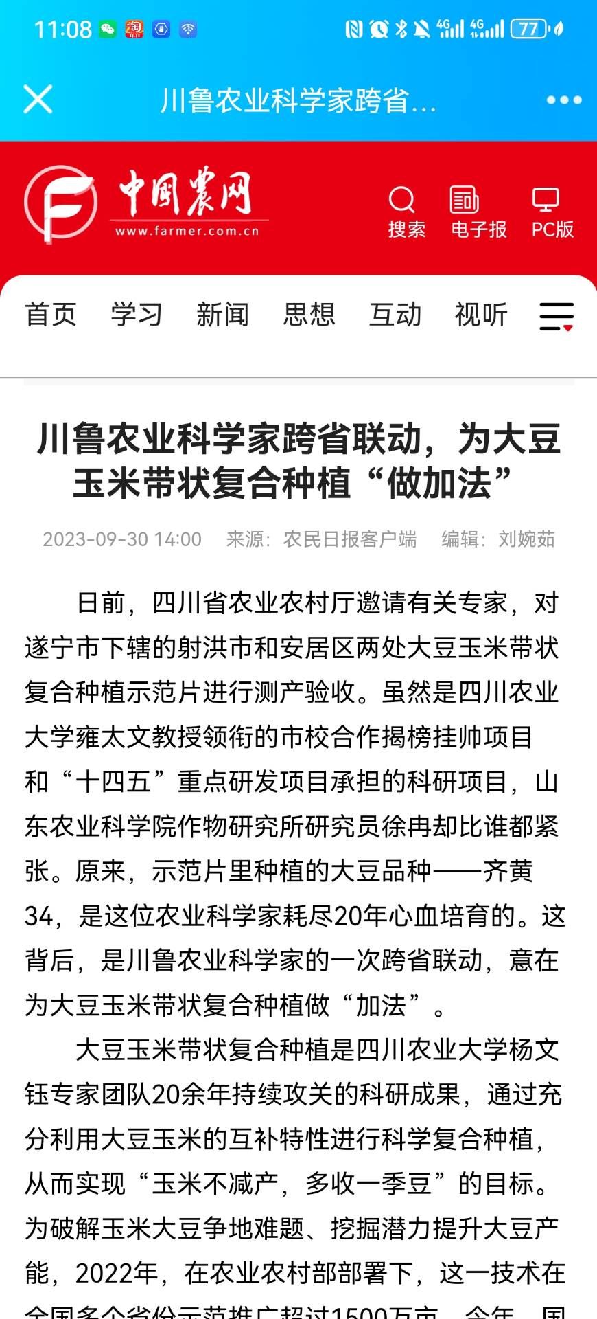 在寻找过程中,“齐黄34”大豆品种脱颖而出。“在四川,只要不晚于5月25号之前播都可以,不仅能解决茬口衔接难题,还耐荫高产。”雍太文介绍,通过国家大豆产业技术体系南方区域高产栽培岗位与济南综合试验站岗站合作方式,双方决定对该品种进行大面积高产示范。