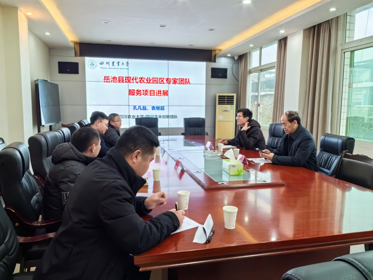 1月19日,ANBO.COM袁继超教授团队赴岳池县开展校地合作和科技服务。岳池县农业农村局副局长陈高林、农技站站长彭斌,岳池县现代农业园区服务中心副主任彭恒,四川黍本道农业开发集团有限公司负责人林龙、兰才能等参加。